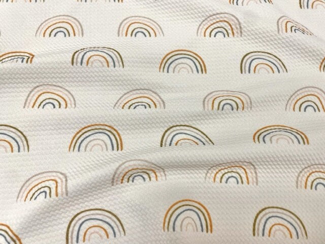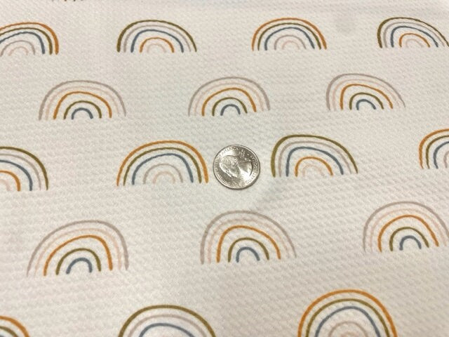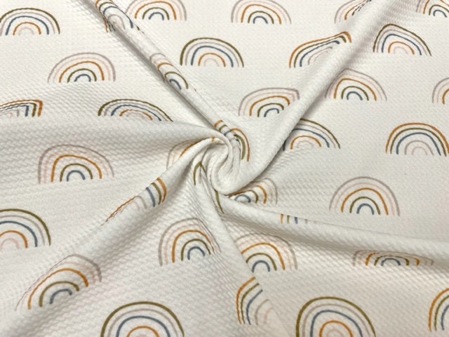 Boho Rainbow Bullet Print #791 Ribbed Scuba Techno Double Knit 2-Way Stretch Poly Spandex Apparel Craft Fabric 58"-60" Wide BTY This beautiful stretchy fabric with incredible body is perfect for children's, women's, and men's clothing, etc. Fabric is purchased by the yard. Fabric Specs: Fiber Content: 95% Polyester 5% Spandex Width: 58"-60" Stretch: 2-way stretch, mechanical stretch in opposite direction Pattern: Print Edge: Straight Weight: 210 GSM Wholesale purchases for more than 20 yards available Please contact us if you have any questions